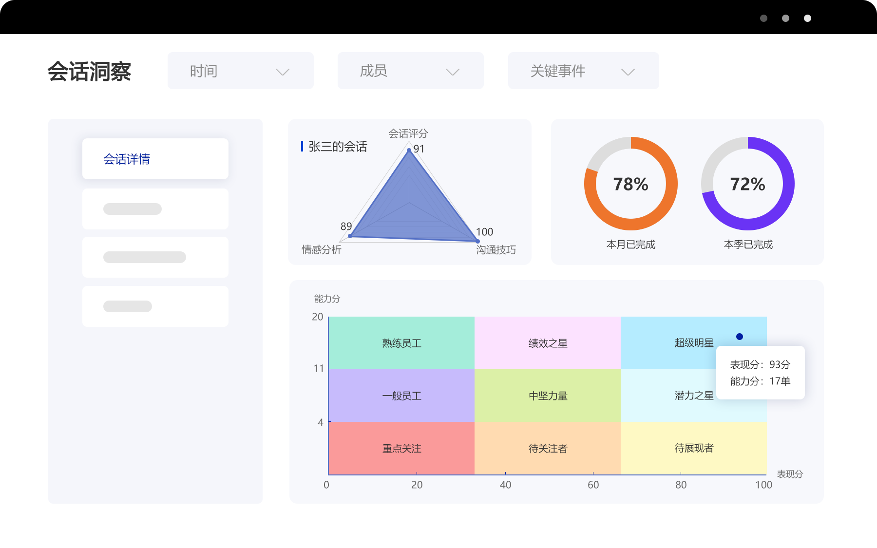 根据新人的互动频率,了解新销售兴趣点,让新人快速成长。帮助管理者更好了解销售人员的能力差异,以及能力表现。