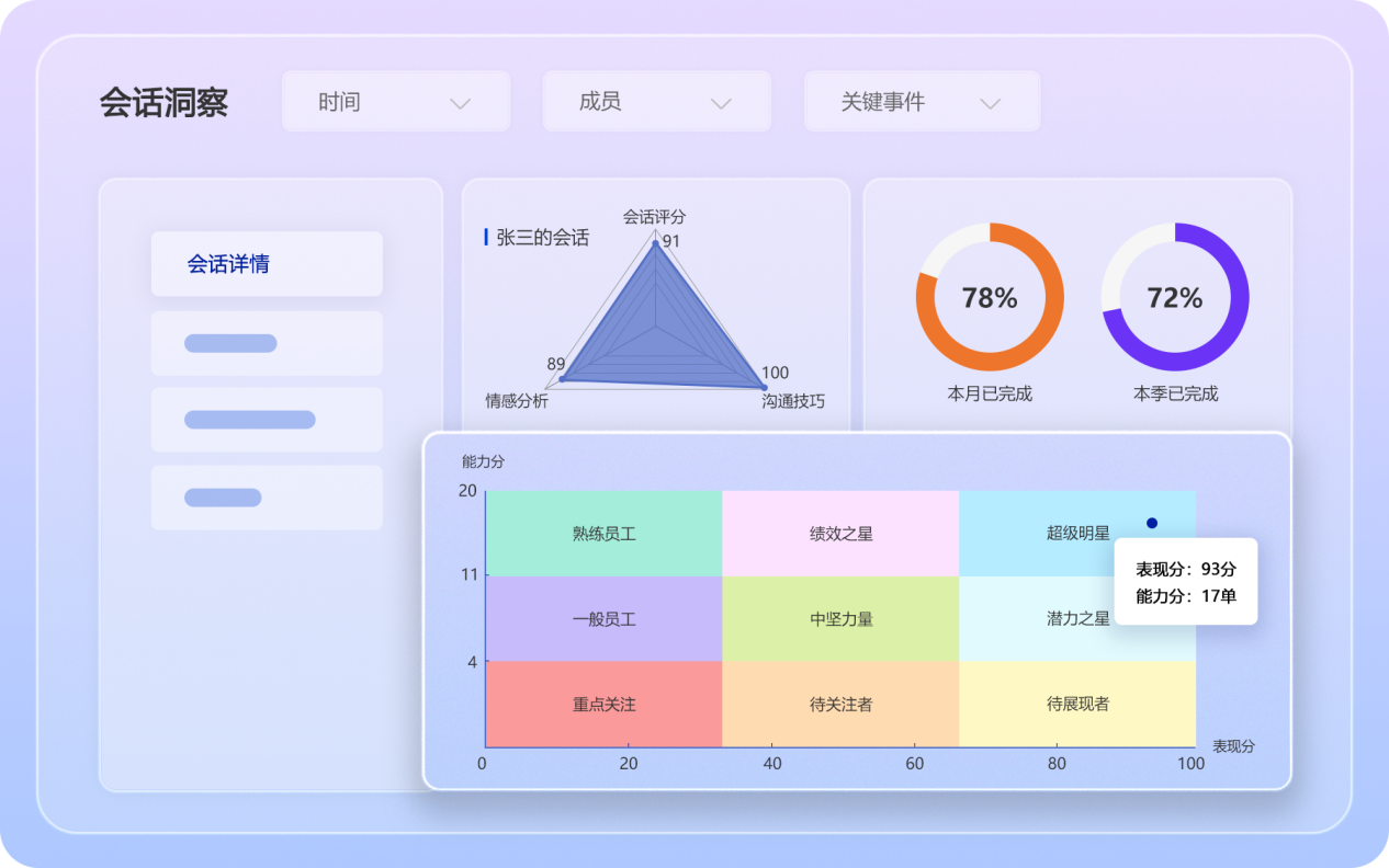 凭借AI销售大脑智能分析,我们为企业提供生成式销售对话训练大模型,以科学、智能的会话分析成功打造金牌销售团队,让优秀的销售能力可复制,全面提升企业销售赢单率。