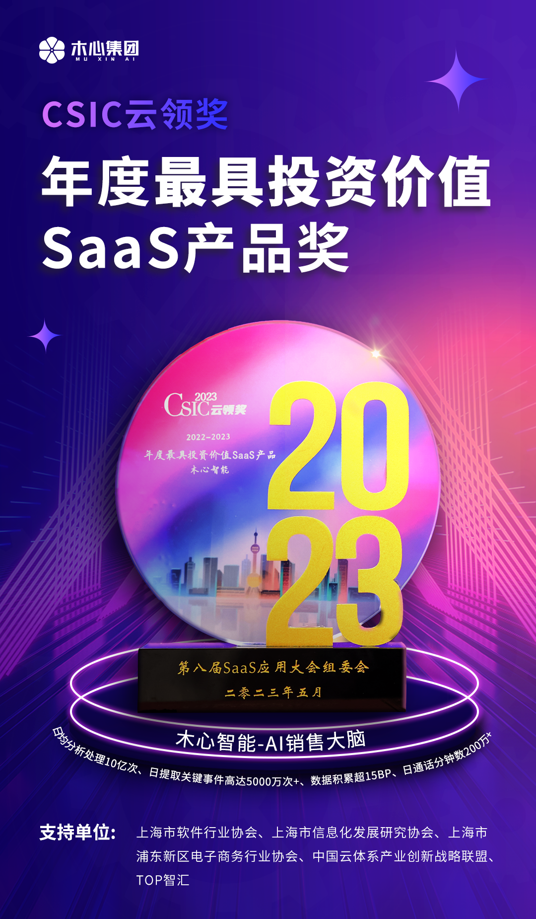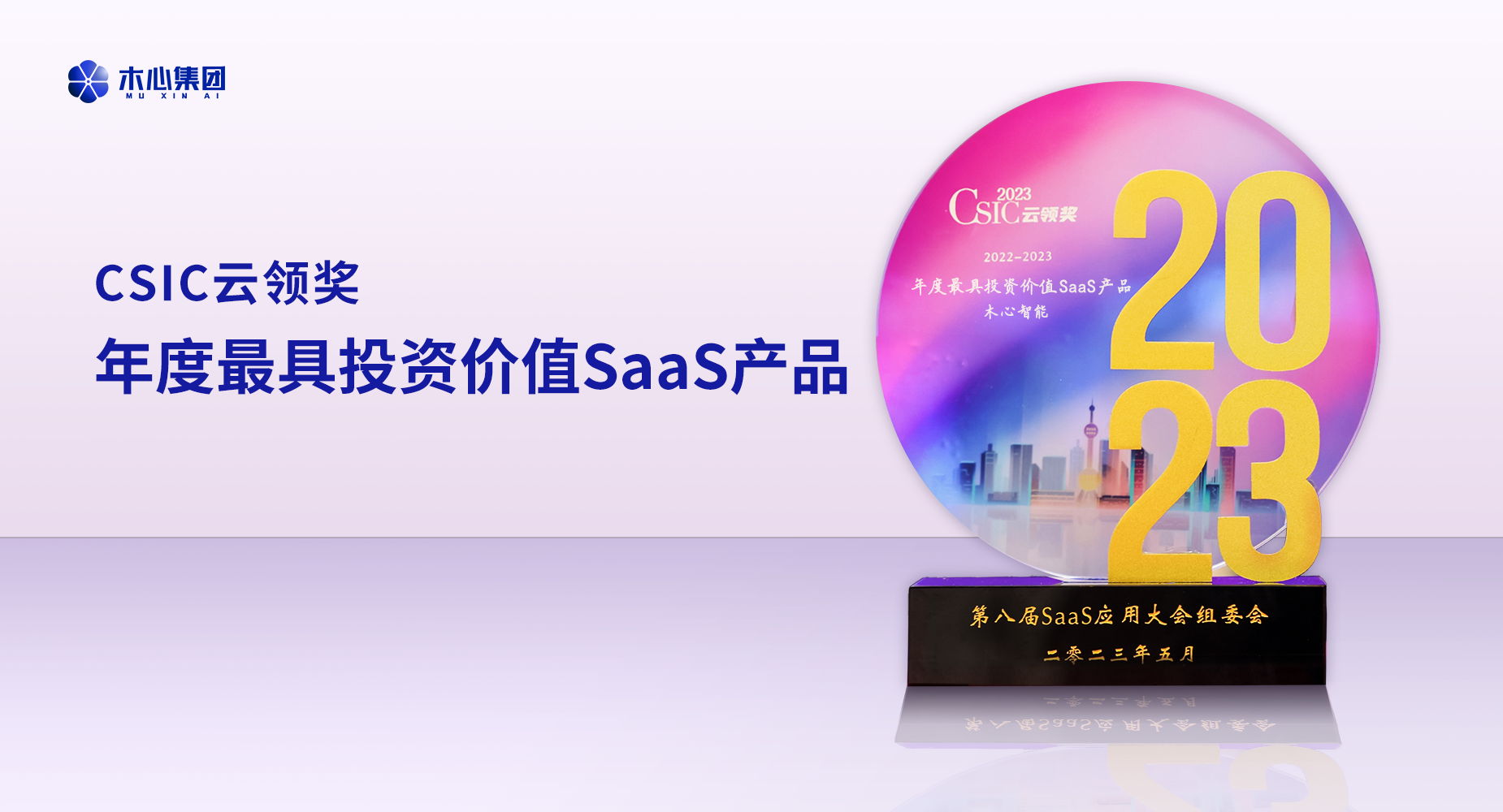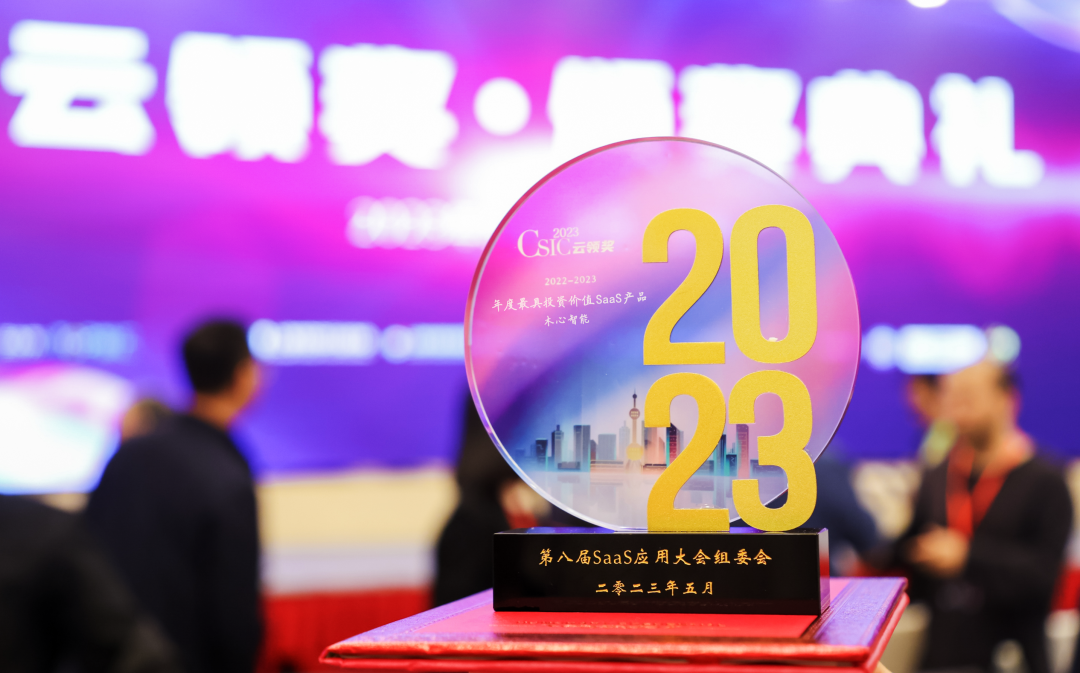 2023年5月25日,由Top智汇、上海市软件行业协会主办的第八届SaaS应用大会在上海盛大召开,在大会同期设有的CSIC 2023 第八届 SaaS 应用大会 “云领奖”评选中, 木心智能凭借在AI数字化领域的持续深耕,荣获“年度最具投资价值SaaS产品”奖项。