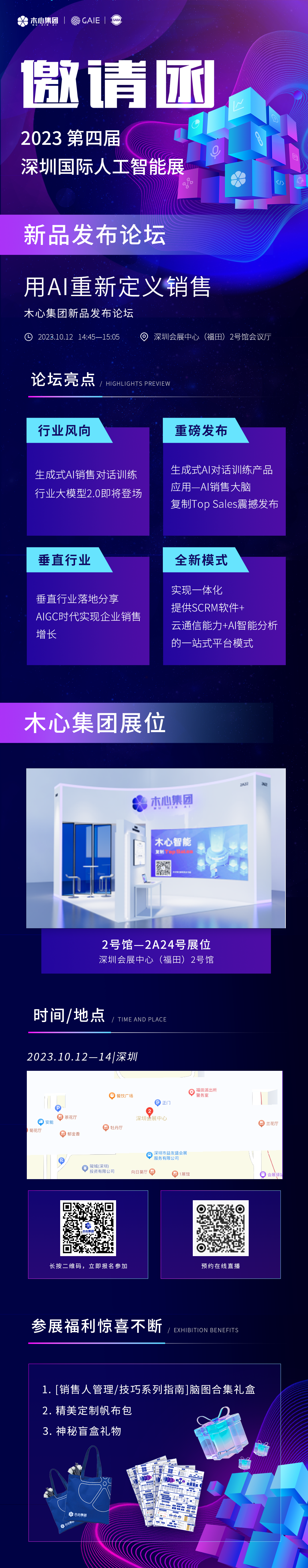 今年,中国正迎来AI产业爆发的机遇窗口。生成式AI将进一步加速企业创新,各大企业之间的生产生态将被重塑。国内行业呈现百模大战局面, 木心集团作为AIGC的中间层和应用层,并聚焦于行业大模型销售领域场景,为此,第四届深圳国际人工智能展会举办期间,由木心集团主办的“AI重新定义销售”新品发布会 即将开启。一同探讨AI时代,销售领域都面临哪些挑战?又该如何发展,拥抱新时代?