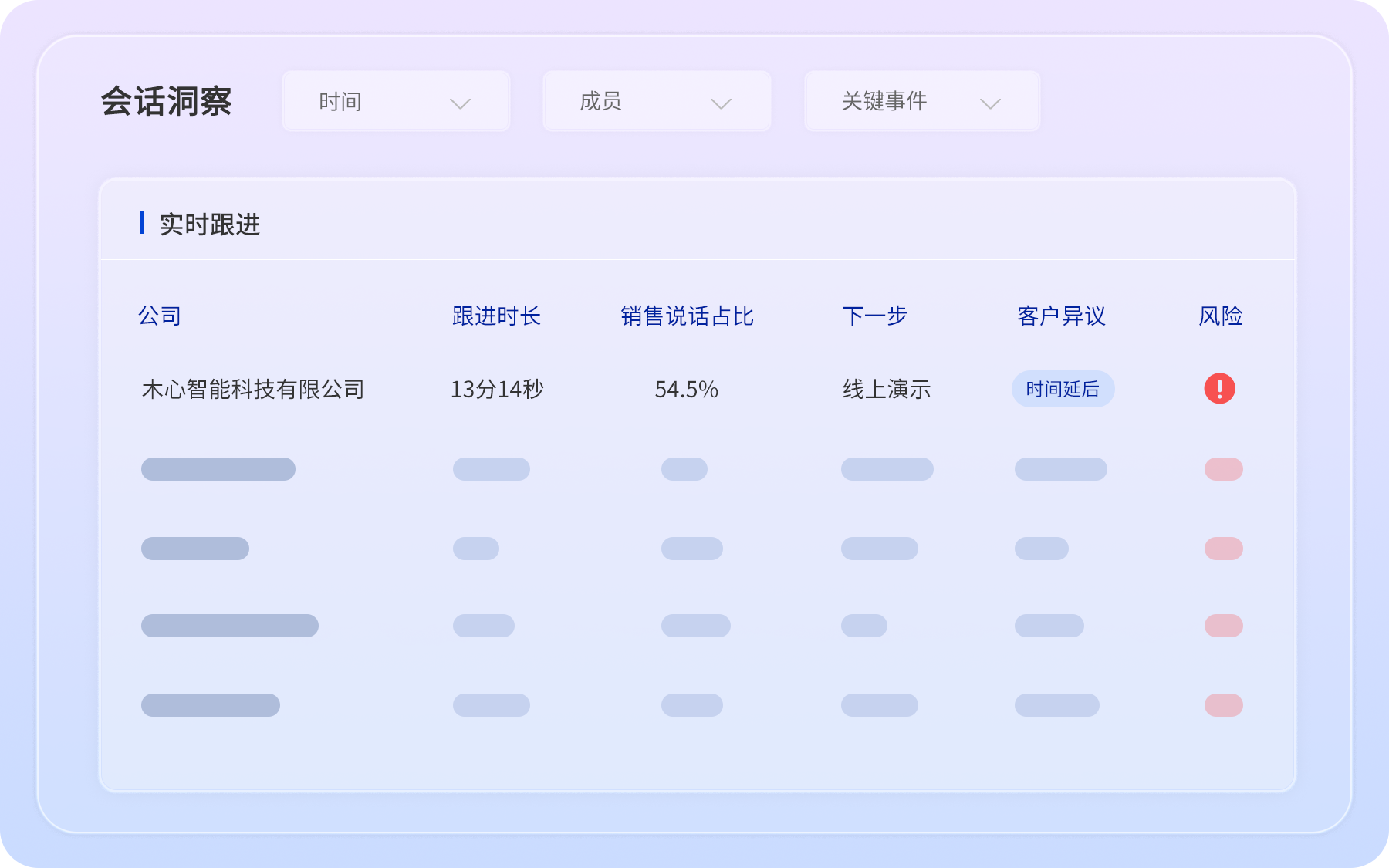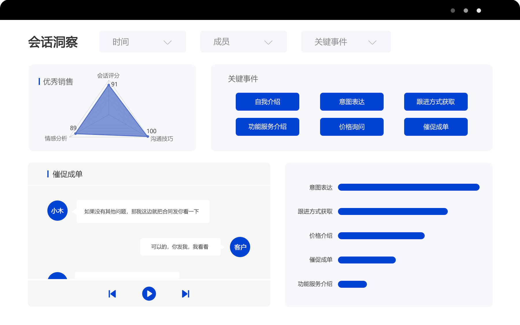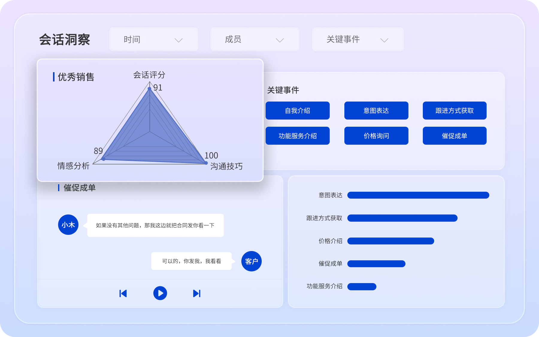 通过沟通频率,说话占比多维度查看沟通健康度,关键事件帮助销售定位会话中的重要信息,有哪些风险行为、成单机会等信息一目了然快速复盘。