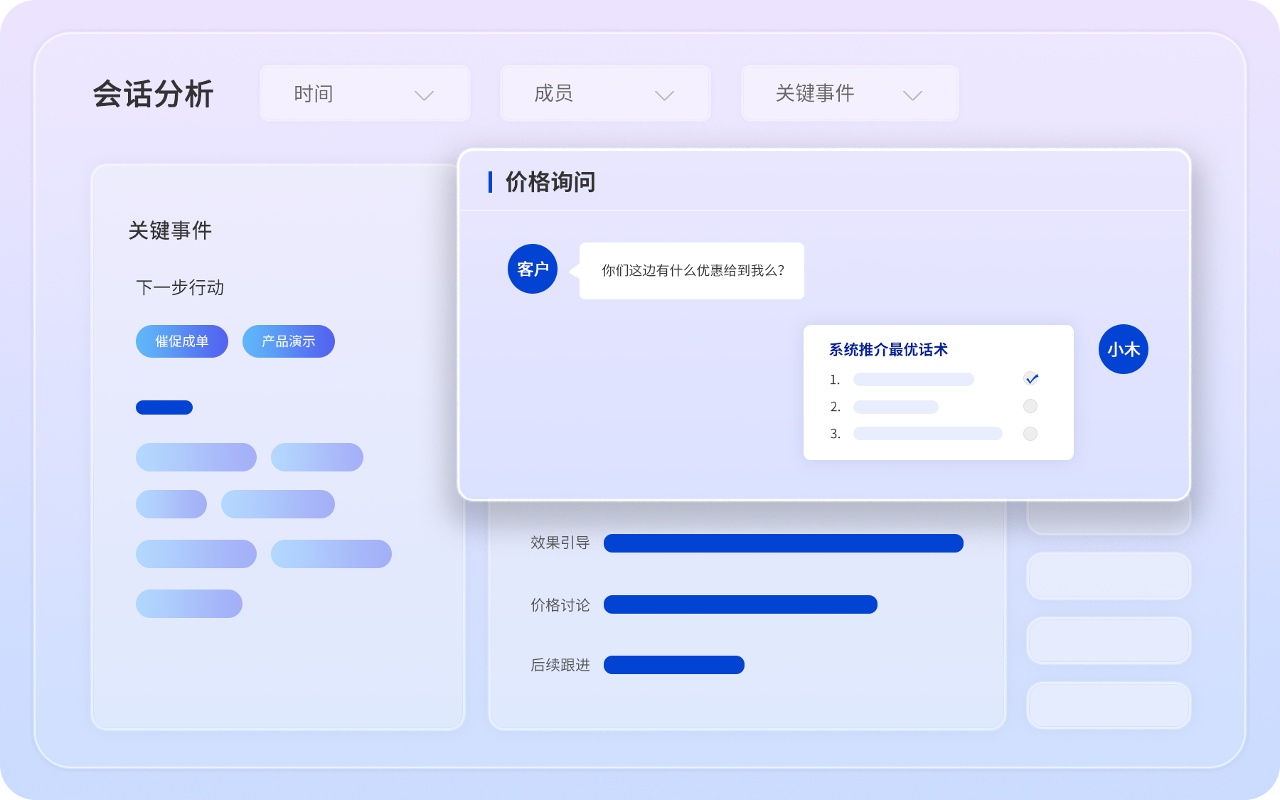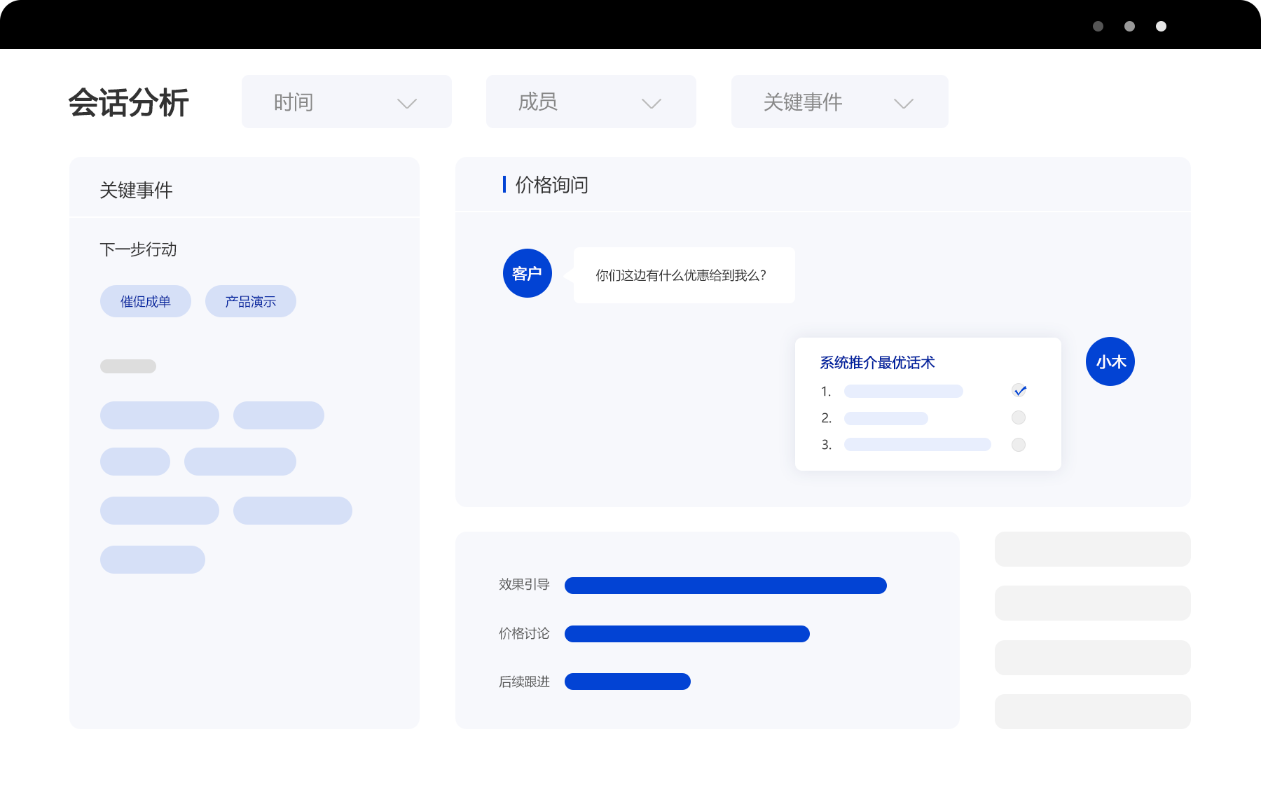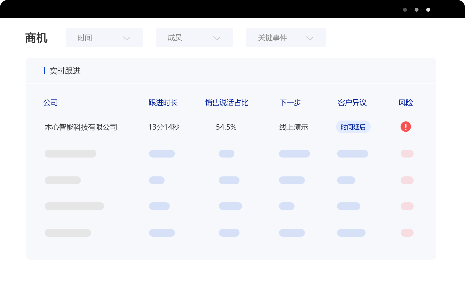 通过沟通频率,说话占比多维度查看沟通健康度,关键事件帮助销售定位会话中的重要信息,有哪些风险行为、成单机会等信息一目了然快速复盘。