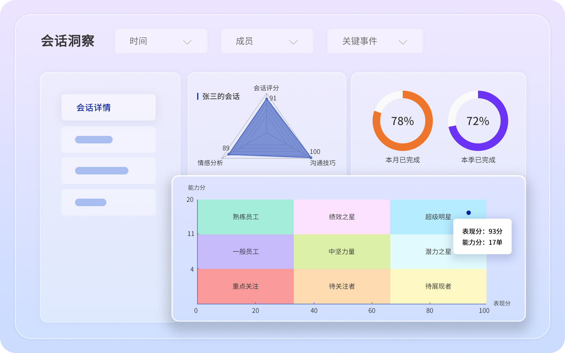 根据新人的互动频率,了解新销售兴趣点,让新人快速成长。帮助管理者更好了解销售人员的能力差异,以及能力表现。